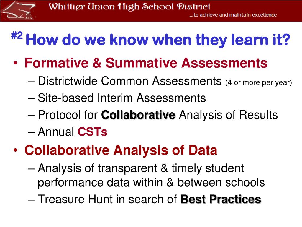 #2 How do we know when they learn it? • Formative & Summative Assessments • Districtwide Common Assessments (4 or more per year) • Site-based Interim Assessments • Protocol for Collaborative Analysis of Results • Annual CSTs • Collaborative Analysis of Data • Analysis of transparent & timely student performance data within & between schools • Treasure Hunt in search of Best Practices