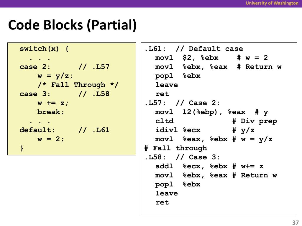 Code Blocks (Partial) switch(x) { . . . case 2: // .L57 w = y/z; /* Fall Through */ case 3: // .L58 w += z; break; . . . default: // .L61 w = 2; } .L61: // Default case movl $2, %ebx # w = 2 movl %ebx, %eax # Return w popl %ebx leave ret .L57: // Case 2: movl 12(%ebp), %eax # y cltd # Div prep idivl %ecx # y/z movl %eax, %ebx # w = y/z # Fall through .L58: // Case 3: addl %ecx, %ebx # w+= z movl %ebx, %eax # Return w popl %ebx leave ret