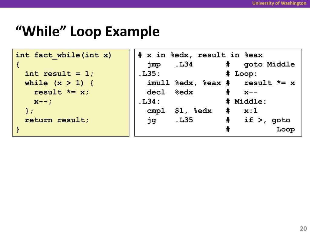 “While” Loop Example # x in %edx, result in %eax jmp.L34 # goto Middle .L35: # Loop: imull %edx, %eax # result *= x decl %edx # x-- .L34: # Middle: cmpl $1, %edx # x:1 jg.L35 # if >, goto # Loop int fact_while(int x) { int result = 1; while (x > 1) { result *= x; x--; }; return result; }