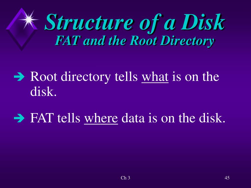 Structure of a Disk FAT and the Root Directory • Root directory tells what is on the disk. • FAT tells where data is on the disk. Ch 3