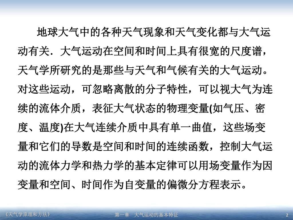 地球大气中的各种天气现象和天气变化都与大气运动有关.大气运动在空间和时间上具有很宽的尺度谱,天气学所研究的是那些与天气和气候有关的大气运动。对这些运动,可忽略离散的分子特性,可以视大气为连续的流体介质,表征大气状态的物理变量(如气压、密度、温度)在大气连续介质中具有单一曲值,这些场变量和它们的导数是空间和时间的连续函数,控制大气运动的流体力学和热力学的基本定律可以用场变量作为因变量和空间、时间作为自变量的偏微分方程表示。 第一章 大气运动的基本特征