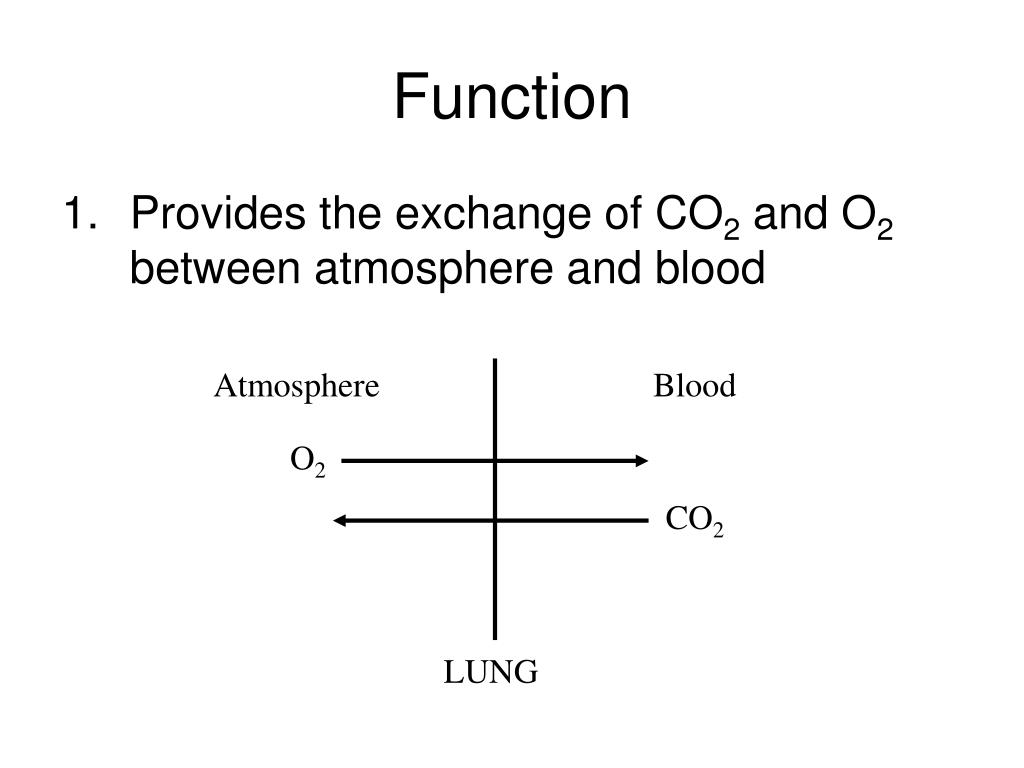 Function • Provides the exchange of CO2 and O2 between atmosphere and blood Atmosphere Blood O2 CO2 LUNG