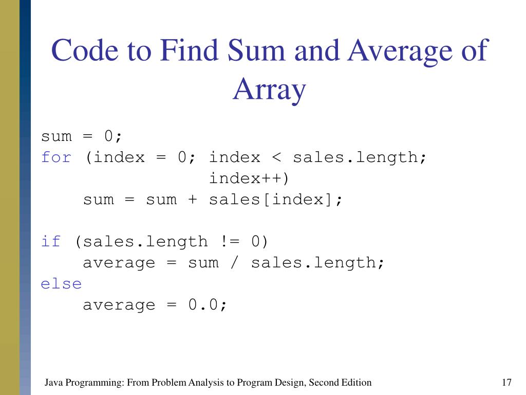 Code to Find Sum and Average of Array sum = 0; for (index = 0; index < sales.length; index++) sum = sum + sales[index]; if (sales.length != 0) average = sum / sales.length; else average = 0.0; Java Programming: From Problem Analysis to Program Design, Second Edition