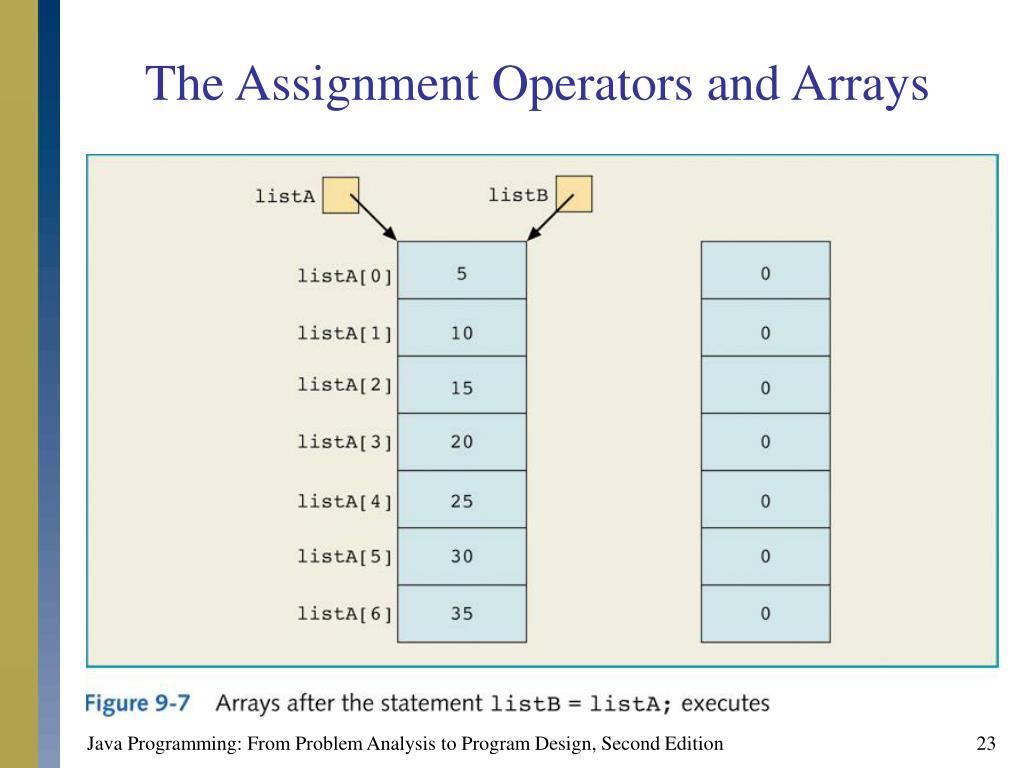 The Assignment Operators and Arrays for (int index = 0; index < listA.length; index++) listB[index] = listA[index]; Java Programming: From Problem Analysis to Program Design, Second Edition
