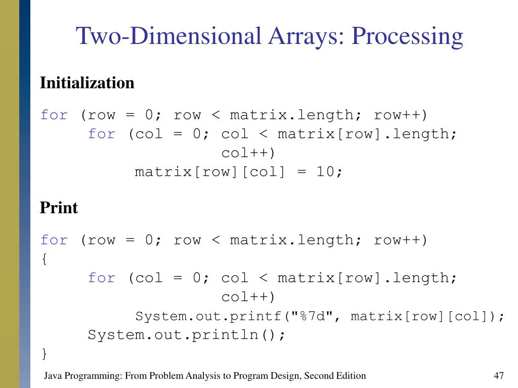 Two-Dimensional Arrays: Processing Initialization for (row = 0; row < matrix.length; row++) for (col = 0; col < matrix[row].length; col++) matrix[row][col] = 10; Print for (row = 0; row < matrix.length; row++) { for (col = 0; col < matrix[row].length; col++) System.out.printf("%7d", matrix[row][col]); System.out.println(); } Java Programming: From Problem Analysis to Program Design, Second Edition