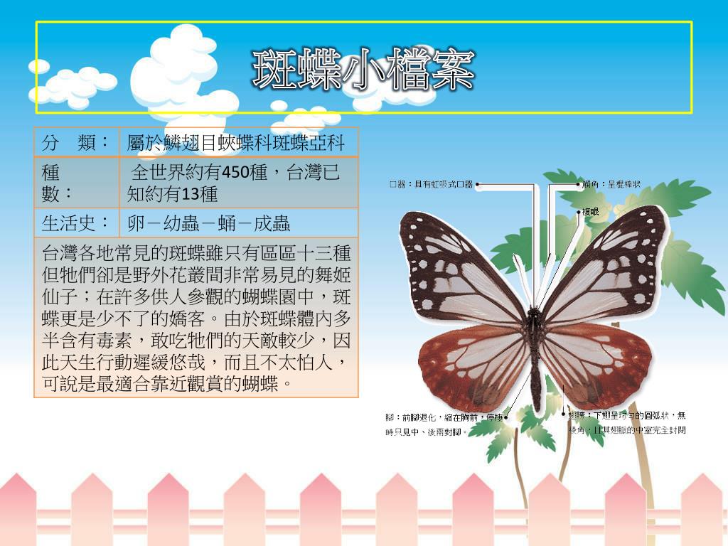 提示 斑蝶 • 分 類: • 屬於鱗翅目蛺蝶科斑蝶亞科 • 種 數: • 全世界約有450種,台灣已知約有13種 • 生活史: • 卵-幼蟲-蛹-成蟲 • 台灣各地常見的斑蝶雖只有區區十三種,但牠們卻是野外花叢間非常易見的舞姬仙子;在許多供人參觀的蝴蝶園中,斑蝶更是少不了的嬌客。由於斑蝶體內多半含有毒素,敢吃牠們的天敵較少,因此天生行動遲緩悠哉,而且不太怕人,可說是最適合靠近觀賞的蝴蝶。
