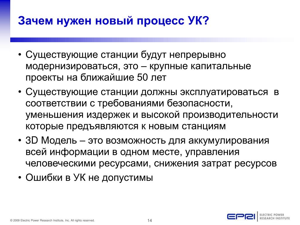 Зачем нужен новый процесс УК? • Существующие станции будут непрерывно модернизироваться, это – крупные капитальные проекты на ближайшие 50 лет • Существующие станции должны эксплуатироваться в соответствии с требованиями безопасности, уменьшения издержек и высокой производительности которые предъявляются к новым станциям • 3D Модель – это возможность для аккумулирования всей информации в одном месте, управления человеческими ресурсами, снижения затрат ресурсов • Ошибки в УК не допустимы