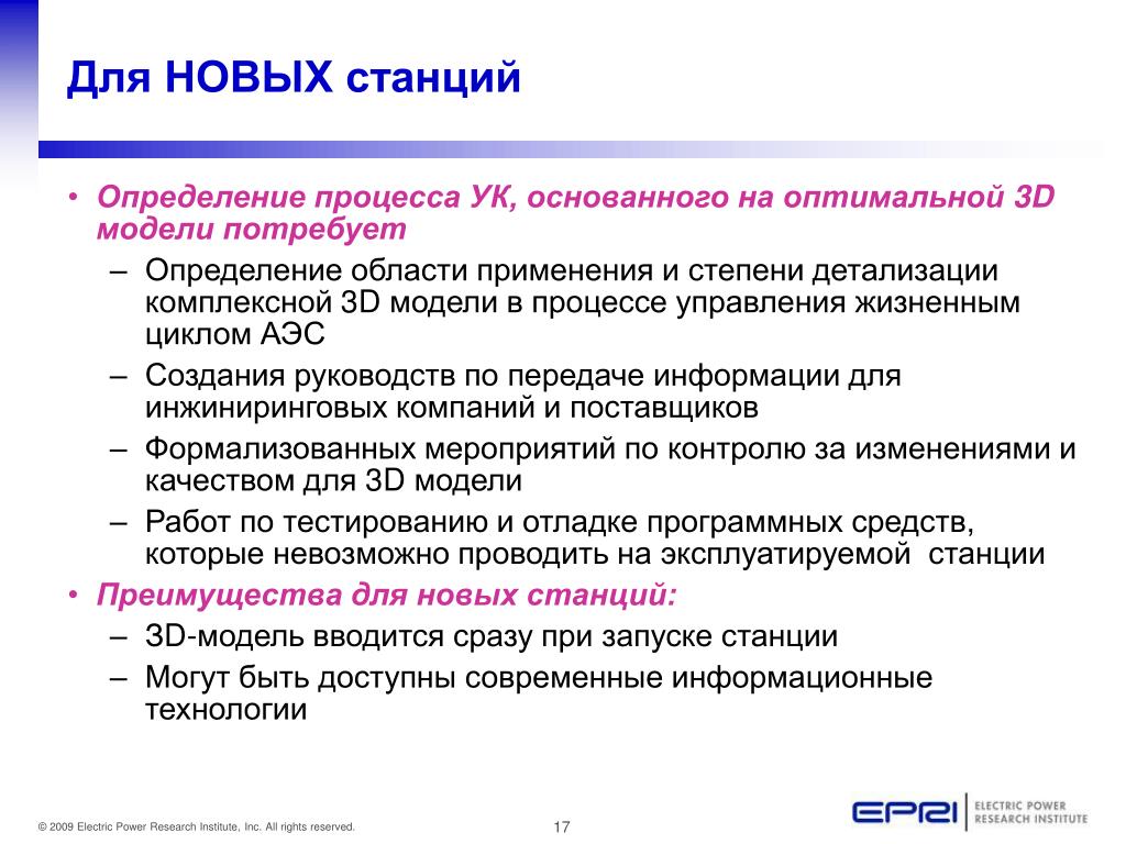 Для НОВЫХ станций • Определение процесса УК, основанного на оптимальной 3D модели потребует • Определение области применения и степени детализации комплексной 3D модели в процессе управления жизненным циклом АЭС • Создания руководств по передаче информации для инжиниринговых компаний и поставщиков • Формализованных мероприятий по контролю за изменениями и качеством для 3D модели • Работ по тестированию и отладке программных средств, которые невозможно проводить на эксплуатируемой станции • Преимущества для новых станций: • ЗD-модель вводится сразу при запуске станции • Могут быть доступны современные информационные технологии