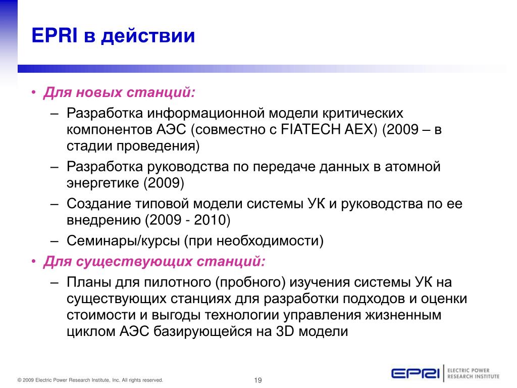 EPRI в действии • Для новых станций: • Разработка информационной модели критических компонентов АЭС (совместно с FIATECH AEX) (2009 – в стадии проведения) • Разработка руководства по передаче данных в атомной энергетике (2009) • Создание типовой модели системы УК и руководства по ее внедрению (2009 - 2010) • Семинары/курсы (при необходимости) • Для существующих станций: • Планы дляпилотного (пробного) изучения системы УК на существующих станциях для разработки подходов и оценки стоимости и выгоды технологии управления жизненным циклом АЭС базирующейся на 3D модели