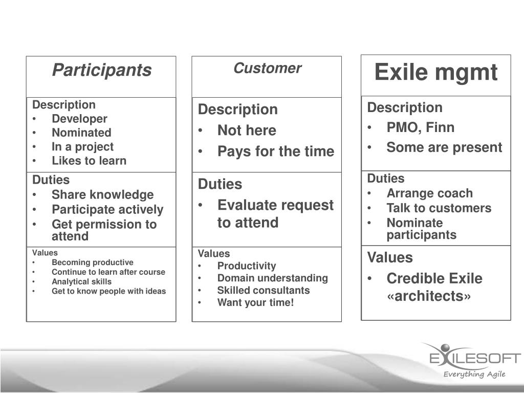Exile mgmt Customer Description PMO, Finn Some are present Description Developer Nominated In a project Likes to learn Description Not here Pays for the time Participants Duties Arrange coach Talk to customers Nominate participants Duties Share knowledge Participate actively Get permission to attend Duties Evaluate request to attend Values Credible Exile «architects» Values Becoming productive Continue to learn after course Analytical skills Get to know people with ideas Values Productivity Domain understanding Skilled consultants Want your time!