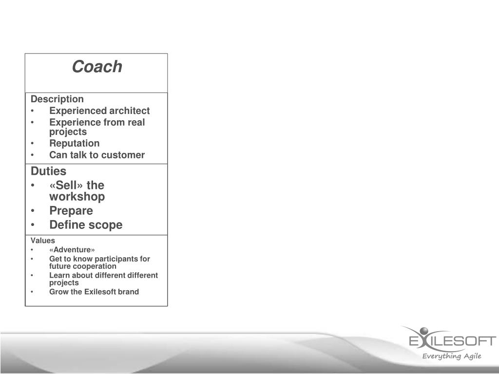 Description Experienced architect Experience from real projects Reputation Can talk to customer Coach Duties «Sell» the workshop Prepare Define scope Values «Adventure» Get to know participants for future cooperation Learn about different different projects Grow the Exilesoft brand