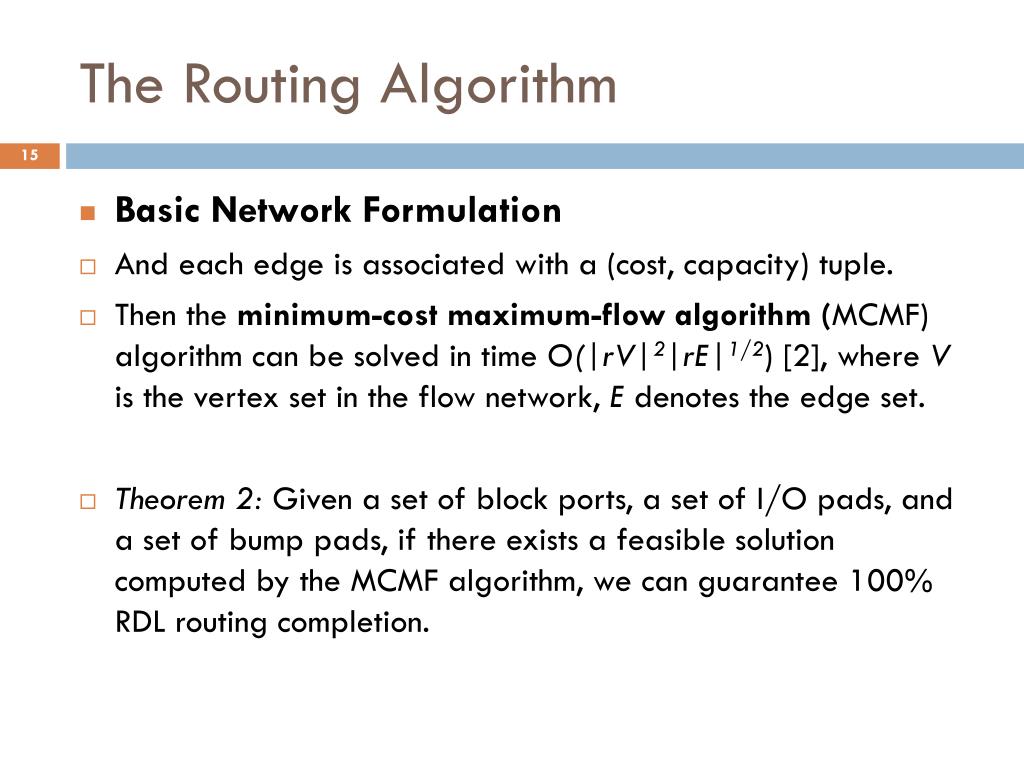 The Routing Algorithm • Basic Network Formulation • And each edge is associated with a (cost, capacity) tuple. • Then the minimum-cost maximum-flow algorithm (MCMF) algorithm can be solved in time O(|rV|2|rE|1/2) [2], where V is the vertex set in the flow network, E denotes the edge set. • Theorem 2: Given a set of block ports, a set of I/O pads, and a set of bump pads, if there exists a feasible solution computed by the MCMF algorithm, we can guarantee 100% RDL routing completion.
