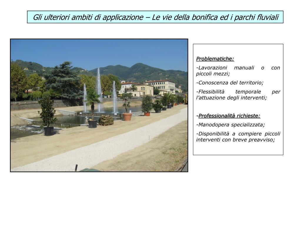 Gli ulteriori ambiti di applicazione – Le vie della bonifica ed i parchi fluviali • Problematiche: • Lavorazioni manuali o con piccoli mezzi; • Conoscenza del territorio; • Flessibilità temporale per l’attuazione degli interventi; • Professionalità richieste: • Manodopera specializzata; • Disponibilità a compiere piccoli interventi con breve preavviso;