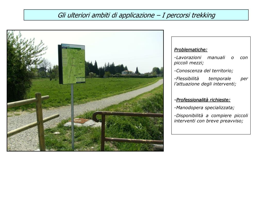 Gli ulteriori ambiti di applicazione – I percorsi trekking • Problematiche: • Lavorazioni manuali o con piccoli mezzi; • Conoscenza del territorio; • Flessibilità temporale per l’attuazione degli interventi; • Professionalità richieste: • Manodopera specializzata; • Disponibilità a compiere piccoli interventi con breve preavviso;