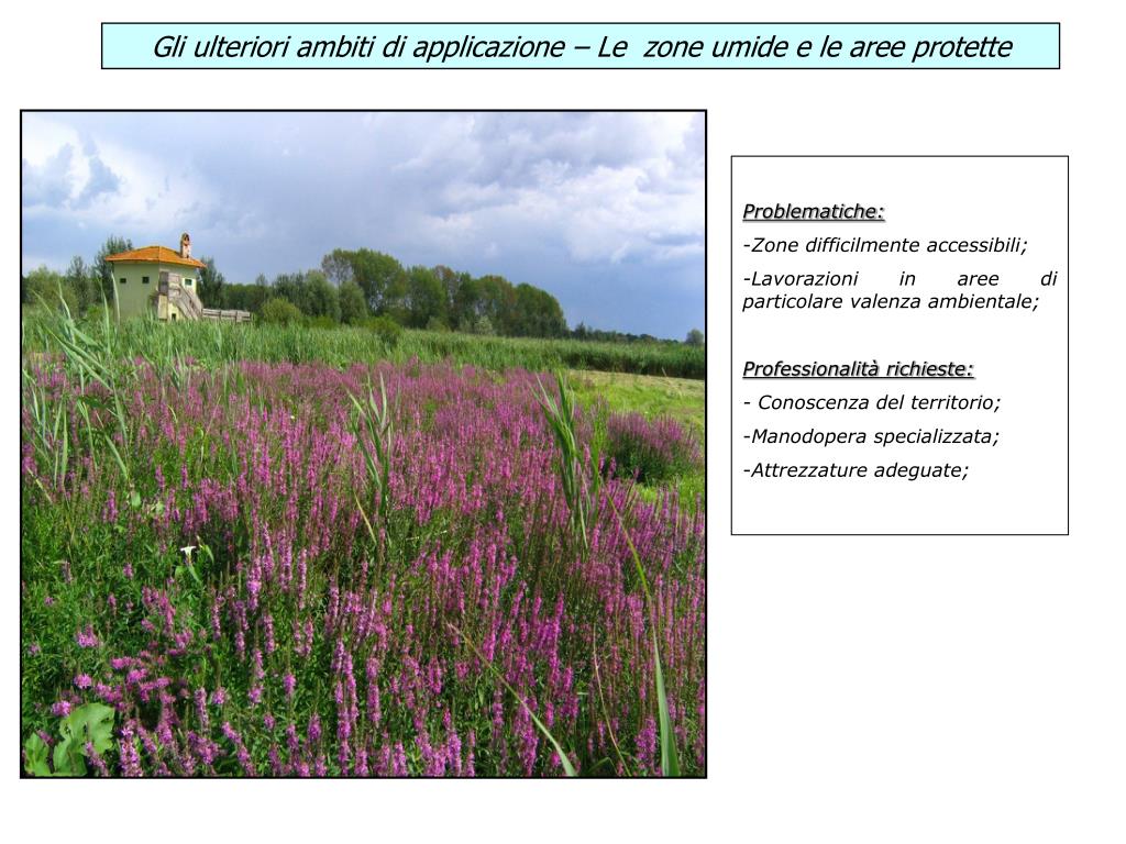 Gli ulteriori ambiti di applicazione – Le zone umide e le aree protette • Problematiche: • Zone difficilmente accessibili; -Lavorazioni in aree di particolare valenza ambientale; • Professionalità richieste: • - Conoscenza del territorio; • Manodopera specializzata; • Attrezzature adeguate;