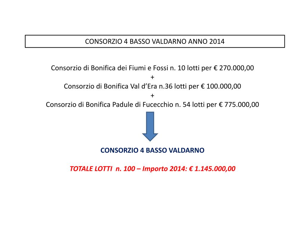 CONSORZIO 4 BASSO VALDARNO ANNO 2014 Consorzio di Bonifica dei Fiumi e Fossi n. 10 lotti per € 270.000,00 + Consorzio di Bonifica Val d’Era n.36 lotti per € 100.000,00 + Consorzio di Bonifica Padule di Fucecchio n. 54 lotti per € 775.000,00 CONSORZIO 4 BASSO VALDARNO TOTALE LOTTI n. 100 – Importo 2014: € 1.145.000,00