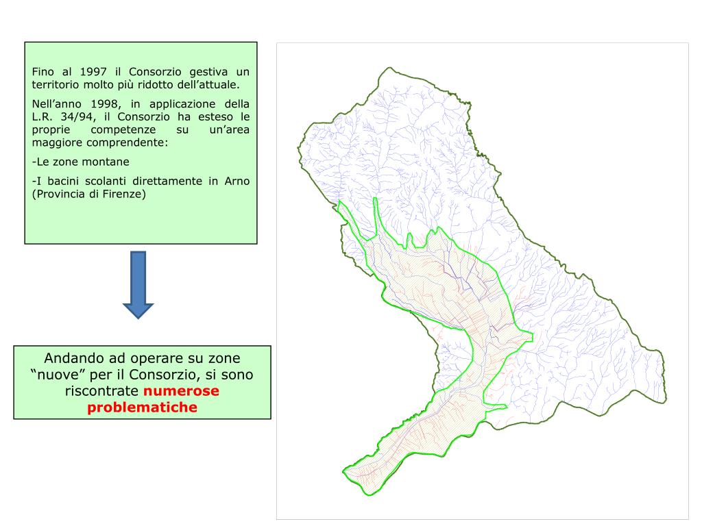 Fino al 1997 il Consorzio gestiva un territorio molto più ridotto dell’attuale. Nell’anno 1998, in applicazione della L.R. 34/94, il Consorzio ha esteso le proprie competenze su un’area maggiore comprendente: • Le zone montane • I bacini scolanti direttamente in Arno (Provincia di Firenze) Andando ad operare su zone “nuove” per il Consorzio, si sono riscontrate numerose problematiche