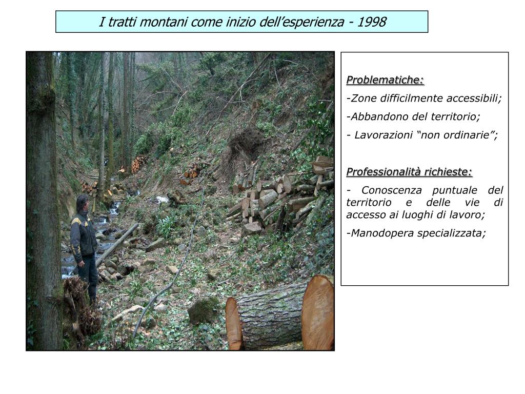 I tratti montani come inizio dell’esperienza - 1998 Problematiche: • Zone difficilmente accessibili; • Abbandono del territorio; • - Lavorazioni “non ordinarie”; Professionalità richieste: - Conoscenza puntuale del territorio e delle vie di accesso ai luoghi di lavoro; • Manodopera specializzata;