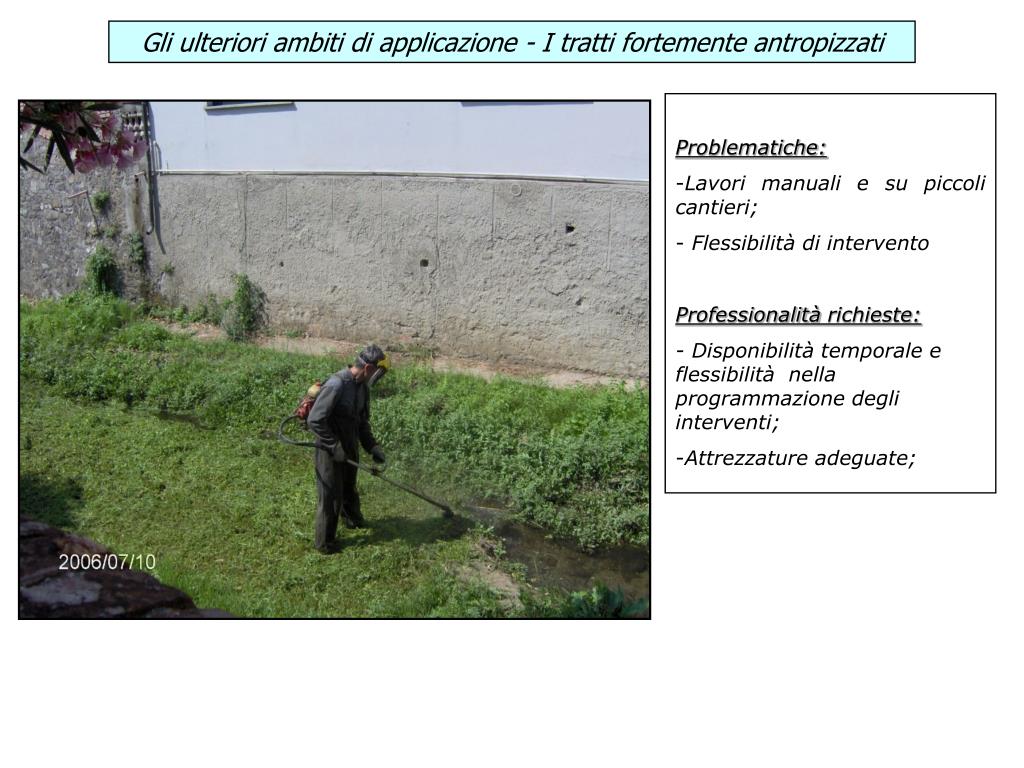 Gli ulteriori ambiti di applicazione - I tratti fortemente antropizzati Problematiche: • Lavori manuali e su piccoli cantieri; • Flessibilità di intervento Professionalità richieste: - Disponibilità temporale e flessibilità nella programmazione degli interventi; • Attrezzature adeguate;