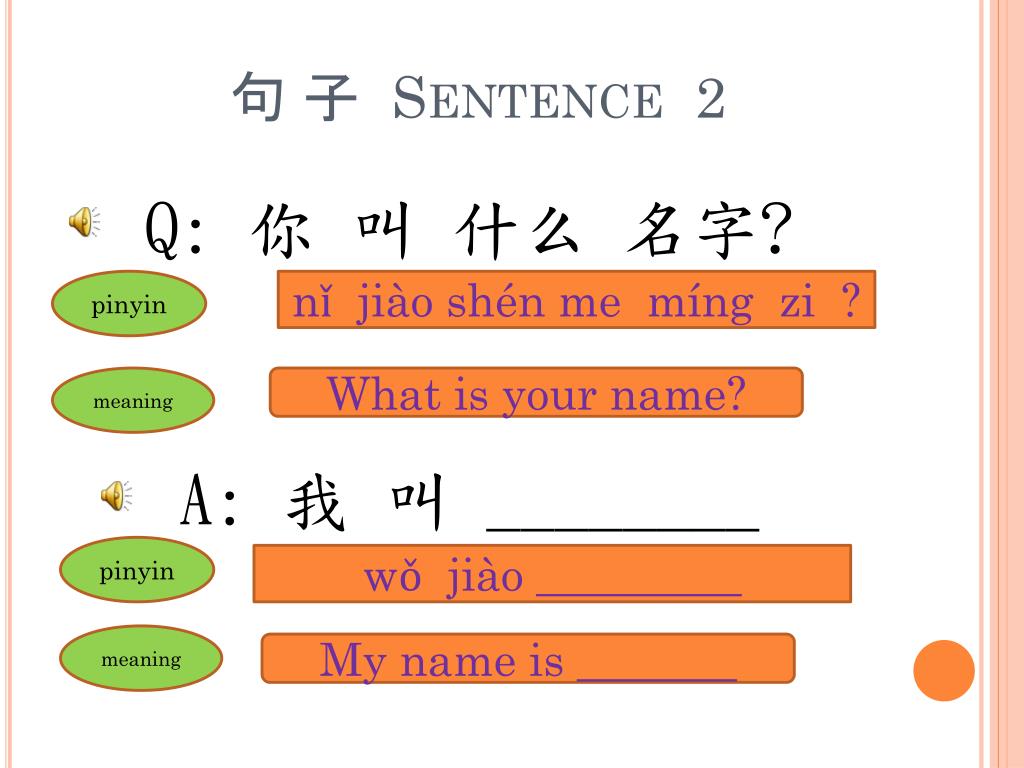 句 子 Sentence 2 Q: 你 叫 什么 名字? A: 我 叫 ________ pinyin nǐjiàoshén memíngzi ? meaning What is your name? pinyin wǒjiào _________ meaning My name is _______