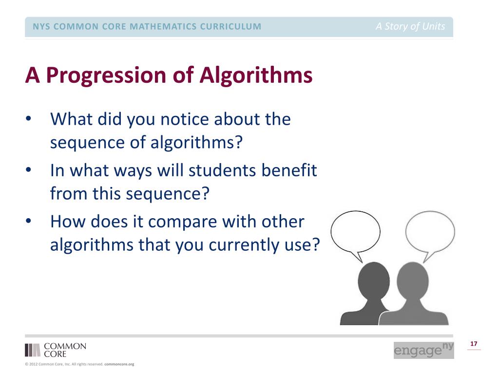 A Progression of Algorithms • What did you notice about the sequence of algorithms? • In what ways will students benefit from this sequence? • How does it compare with other algorithms that you currently use?