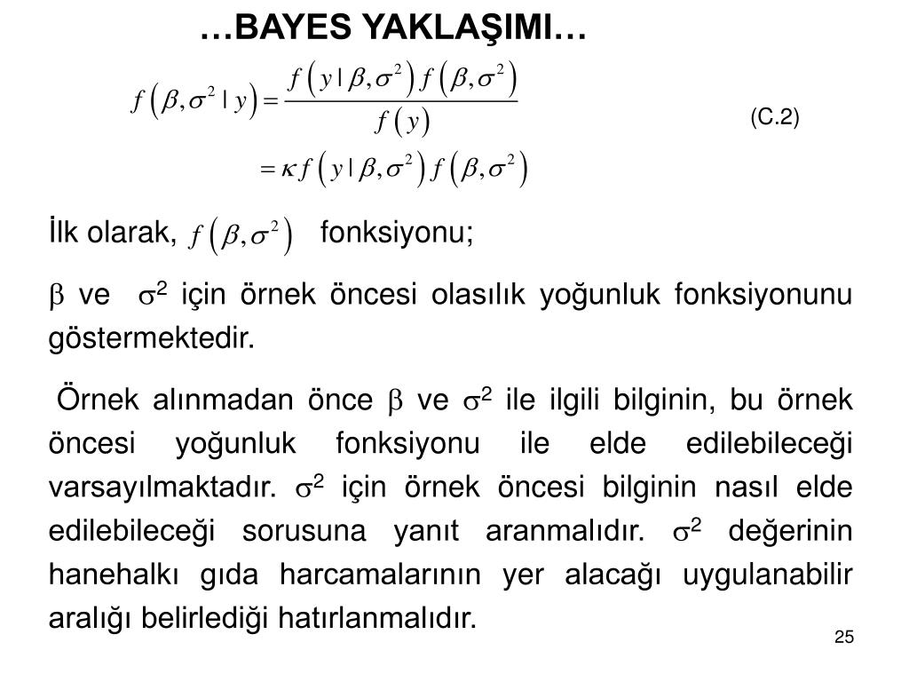 25. …BAYES YAKLAŞIMI… (C.2) İlk olarak, fonksiyonu; b ve s2 için örnek öncesi olasılık yoğunluk fonksiyonunu göstermektedir. Örnek alınmadan önce b ve s2 ile ilgili bilginin, bu örnek öncesi yoğunluk fonksiyonu ile elde edilebileceği varsayılmaktadır. s2 için örnek öncesi bilginin nasıl elde edilebileceği sorusuna yanıt aranmalıdır. s2 değerinin hanehalkı gıda harcamalarının yer alacağı uygulanabilir aralığı belirlediği hatırlanmalıdır.