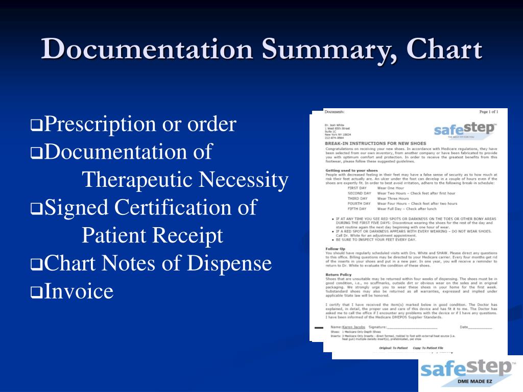 Documentation Summary, Chart • Prescription or order • Documentation of Therapeutic Necessity • Signed Certification of Patient Receipt • Chart Notes of Dispense • Invoice