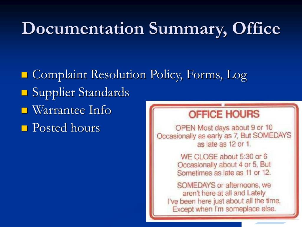 Documentation Summary, Office Complaint Resolution Policy, Forms, Log Supplier Standards Warrantee Info Posted hours