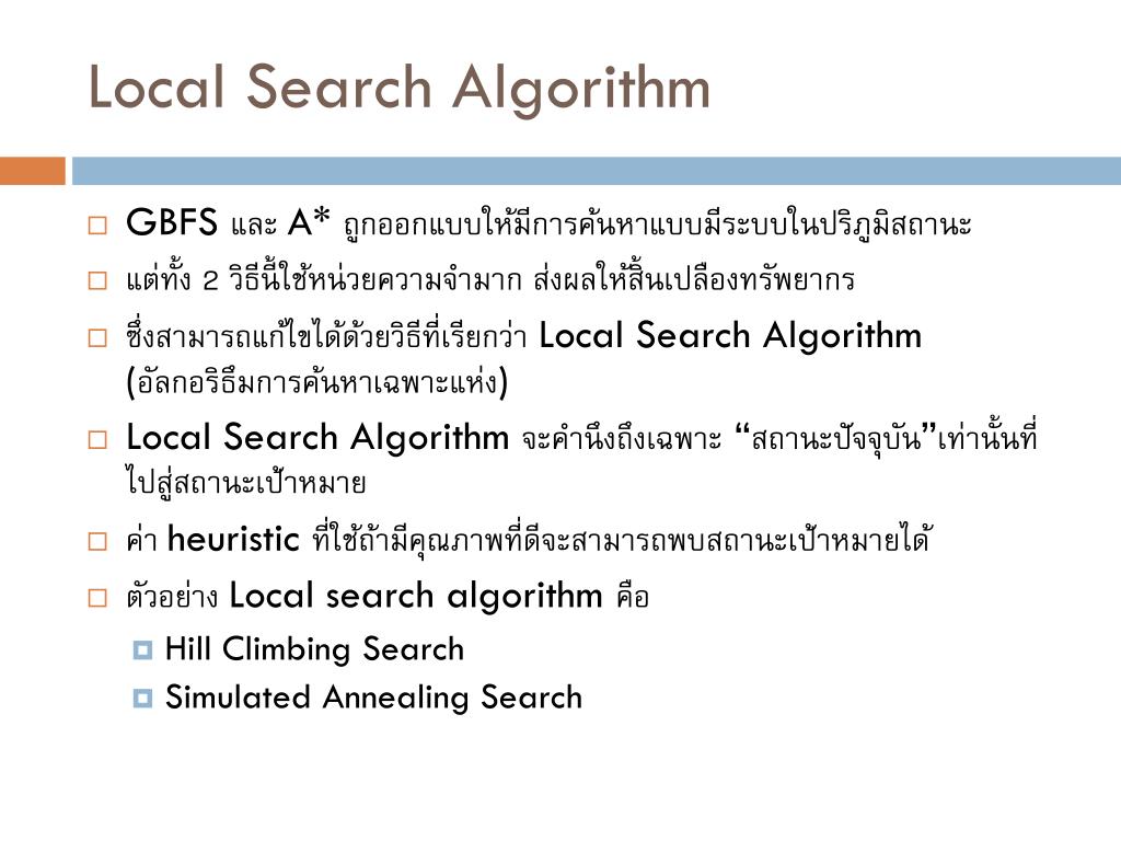Local Search Algorithm • GBFS และ A* ถูกออกแบบให้มีการค้นหาแบบมีระบบในปริภูมิสถานะ • แต่ทั้ง 2 วิธีนี้ใช้หน่วยความจำมาก ส่งผลให้สิ้นเปลืองทรัพยากร • ซึ่งสามารถแก้ไขได้ด้วยวิธีที่เรียกว่า Local Search Algorithm (อัลกอริธึมการค้นหาเฉพาะแห่ง) • Local Search Algorithm จะคำนึงถึงเฉพาะ “สถานะปัจจุบัน”เท่านั้นที่ไปสู่สถานะเป้าหมาย • ค่า heuristic ที่ใช้ถ้ามีคุณภาพที่ดีจะสามารถพบสถานะเป้าหมายได้ • ตัวอย่าง Local search algorithm คือ • Hill Climbing Search • Simulated Annealing Search