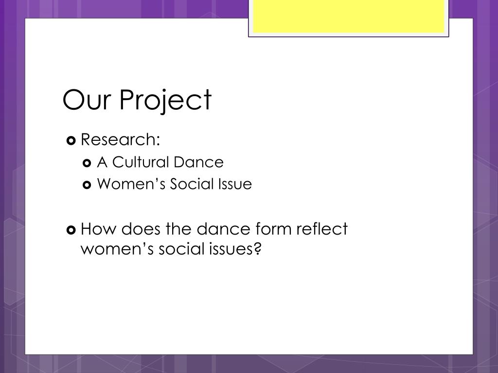 Our Project • Research: • ACultural Dance • Women’s Social Issue • How does the dance form reflect women’s social issues?