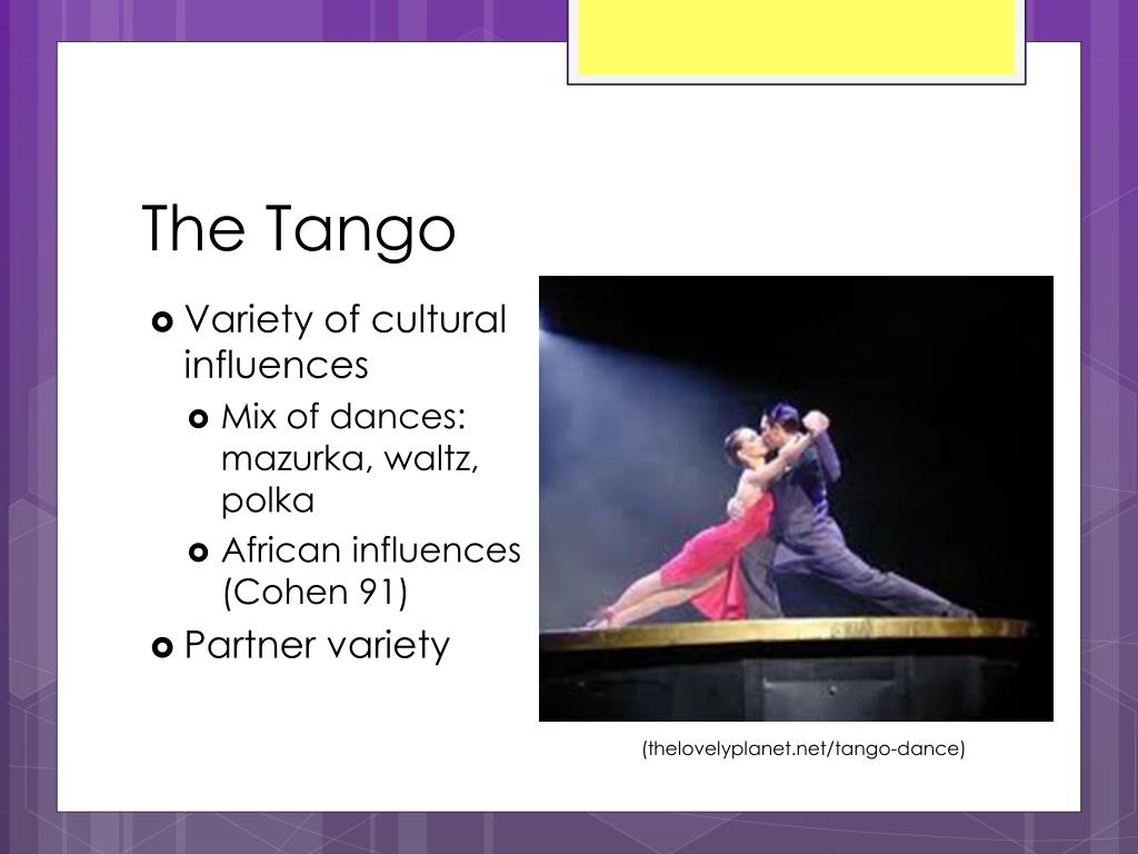 The Tango • Variety of cultural influences • Mix of dances: mazurka, waltz, polka • African influences (Cohen 91) • Partner variety (thelovelyplanet.net/tango-dance)