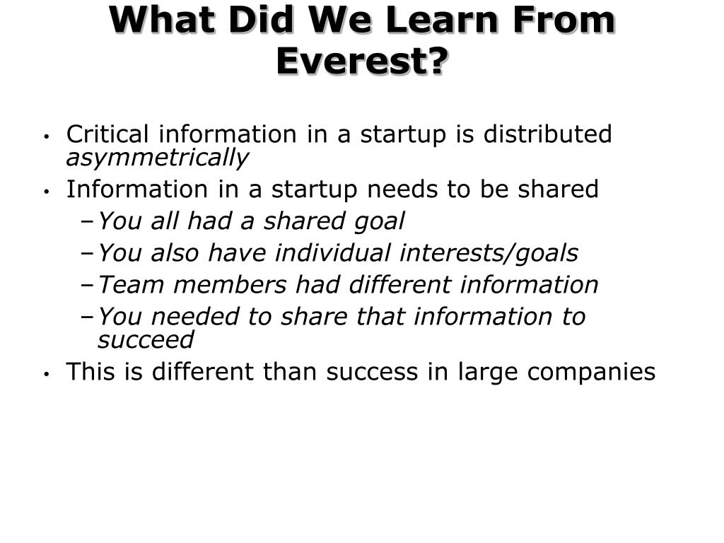 What Did We Learn From Everest? • Critical information in a startup is distributed asymmetrically • Information in a startup needs to be shared • You all had a shared goal • You also have individual interests/goals • Team members had different information • You needed to share that information to succeed • This is different than success in large companies