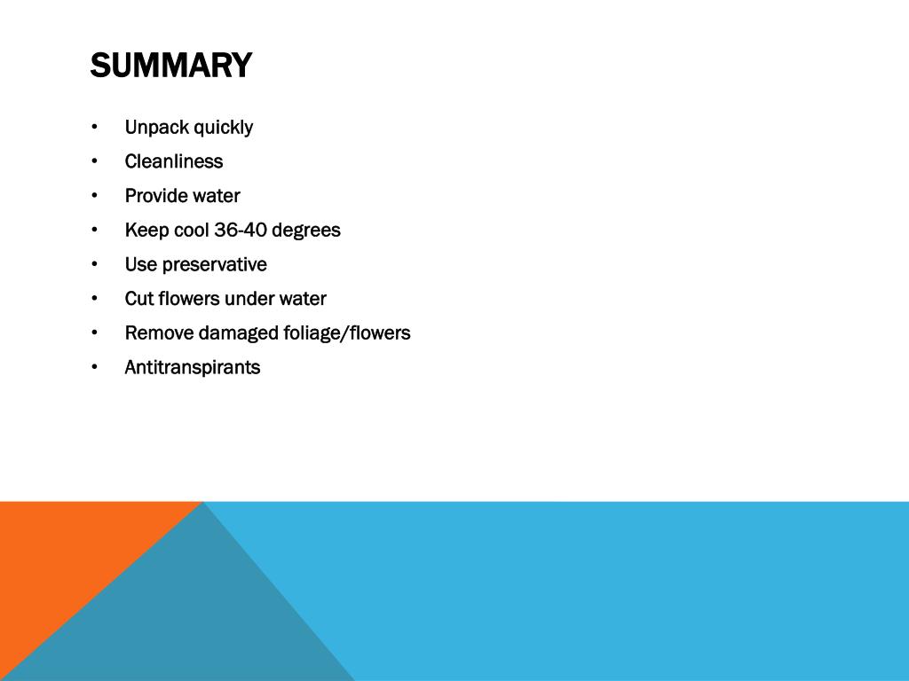 Summary • Unpack quickly • Cleanliness • Provide water • Keep cool 36-40 degrees • Use preservative • Cut flowers under water • Remove damaged foliage/flowers • Antitranspirants