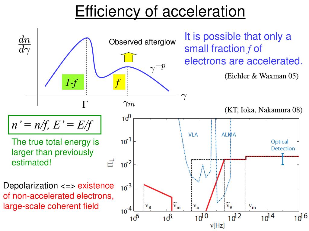 Efficiency of acceleration It is possible that only a small fraction f of electrons are accelerated. Observed afterglow (Eichler & Waxman 05) 1-f f G (KT, Ioka, Nakamura 08) n’ = n/f, E’ = E/f The true total energy is larger than previously estimated! Depolarization <=> existence of non-accelerated electrons, large-scale coherent field