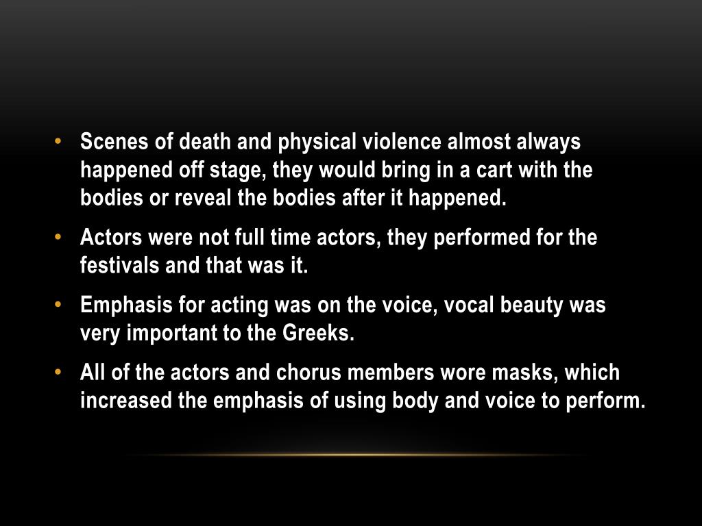 Scenes of death and physical violence almost always happened off stage, they would bring in a cart with the bodies or reveal the bodies after it happened. • Actors were not full time actors, they performed for the festivals and that was it. • Emphasis for acting was on the voice, vocal beauty was very important to the Greeks. • All of the actors and chorus members wore masks, which increased the emphasis of using body and voice to perform.