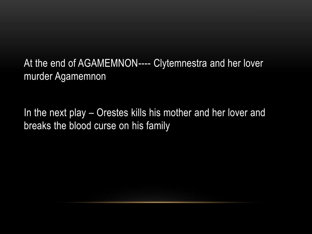 At the end of AGAMEMNON---- Clytemnestra and her lover murder Agamemnon In the next play – Orestes kills his mother and her lover and breaks the blood curse on his family