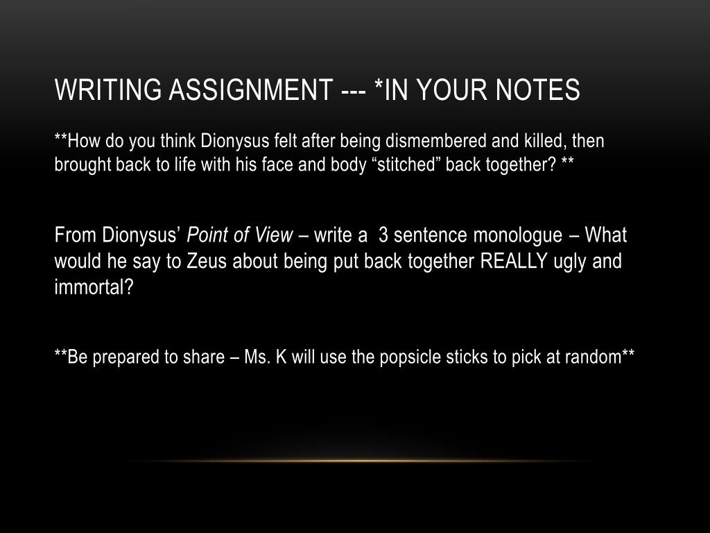 Writing assignment --- *in your notes **How do you think Dionysus felt after being dismembered and killed, then brought back to life with his face and body “stitched” back together? ** From Dionysus’ Point of View – write a 3 sentence monologue – What would he say to Zeus about being put back together REALLY ugly and immortal? **Be prepared to share – Ms. K will use the popsicle sticks to pick at random**