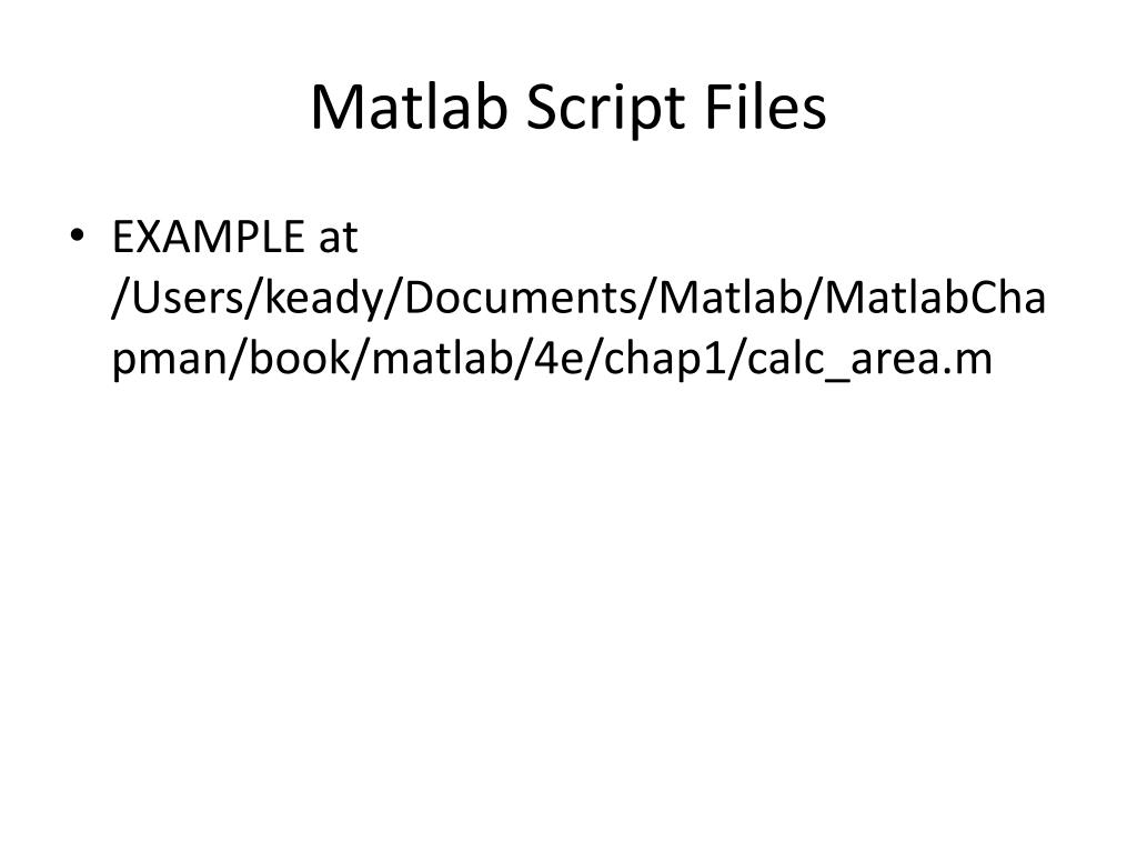 MATLAB Script Files • The preceding file is executed by issuing a MATLAB command: >>calc_area • This single command causes MATLAB to look in the path, and if a file calc_area.m is found, open it and execute all of the commands. • If MATLAB cannot find the file in the path, an error message will appear.