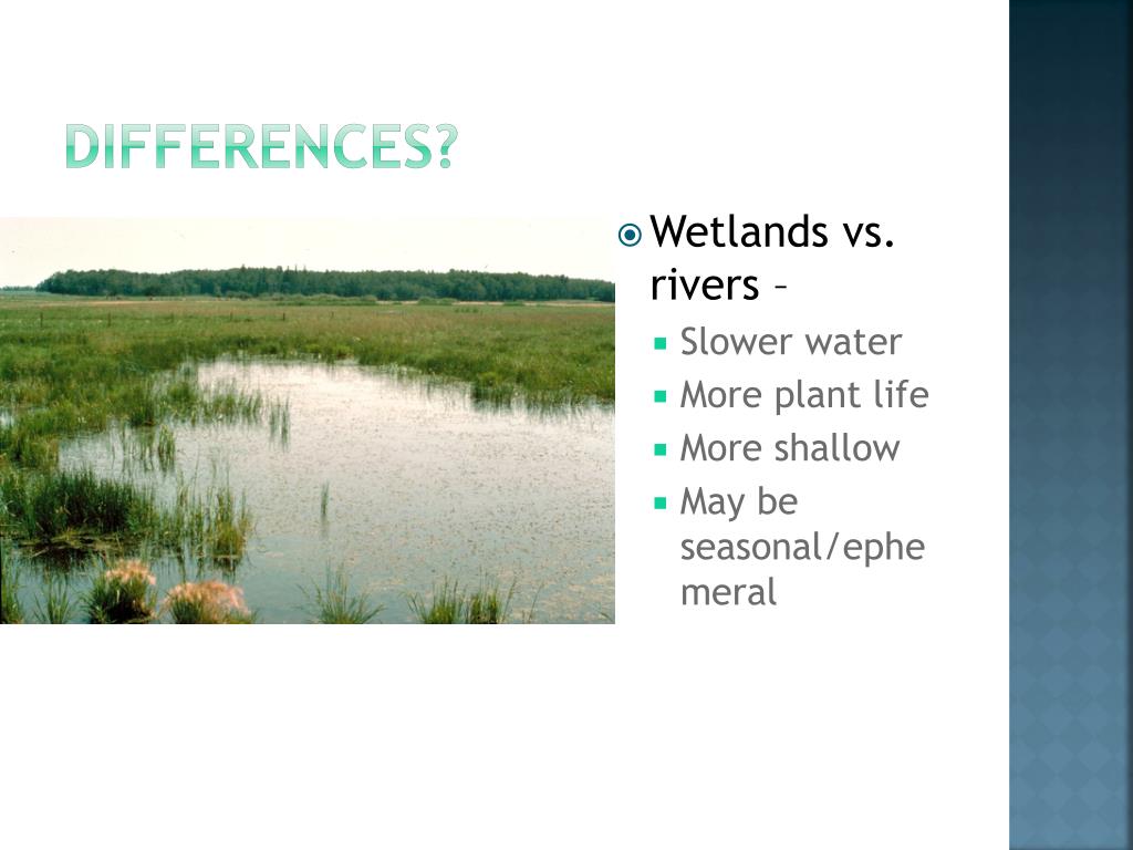Differences? • Wetlands vs. rivers – • Slower water • More plant life • More shallow • May be seasonal/ephemeral