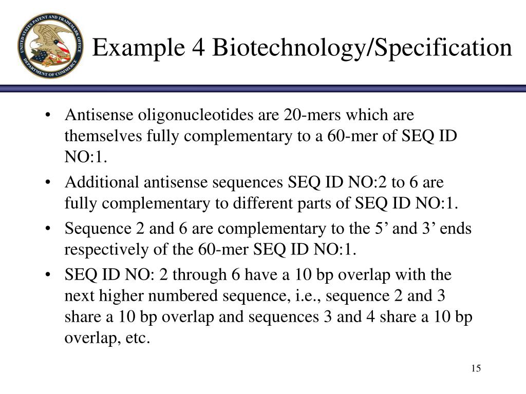 Example 4 Biotechnology/Specification • Antisense oligonucleotides are 20-mers which are themselves fully complementary to a 60-mer of SEQ ID NO:1. • Additional antisense sequences SEQ ID NO:2 to 6 are fully complementary to different parts of SEQ ID NO:1. • Sequence 2 and 6 are complementary to the 5’ and 3’ ends respectively of the 60-mer SEQ ID NO:1. • SEQ ID NO: 2 through 6 have a 10 bp overlap with the next higher numbered sequence, i.e., sequence 2 and 3 share a 10 bp overlap and sequences 3 and 4 share a 10 bp overlap, etc.