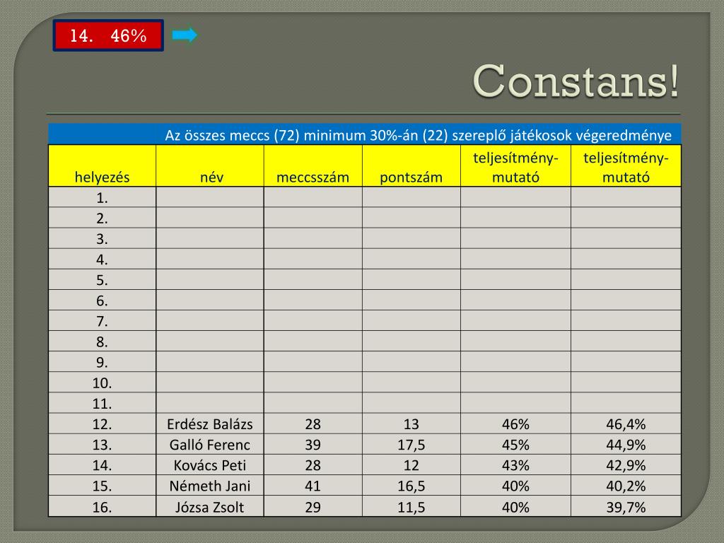Összesítő adatok Értékelt meccsek száma 72 Ezek minimum 30%-a 22 Résztvevő játékosok száma 40 Az összes meccs 30%-án játszott 16 Pákozdi meccsek száma 39 Vörösmarty meccsek száma 20 Seregélyesi meccsek száma 13 Döntetlenek száma 7 Minimum 10-es gólkülönbségű meccsek száma 5