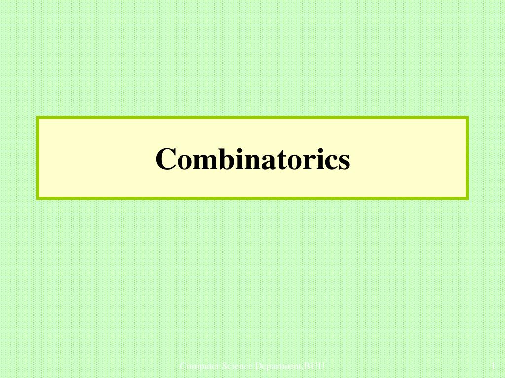 Combinatorics. 1. Combinatorics. เป็นการศึกษาเกี่ยวกับจำนวนวิธีที่แตกต่างกันในการเรียงของ หรือเลือกของหลายสิ่ง ตัวอย่าง เช่น ในการประกวดเรียงความมีผู้เข้าร่วม 100 คน, ผู้ชนะ 10 อันดับแรก จะมีได้กี่แบบ? ถ้ากำหนดรหัสผ่านความยาว 6-8 ตัวประกอบด้วย ตัวอักษรภาษาอังกฤษและ/หรือ ตัวเลข