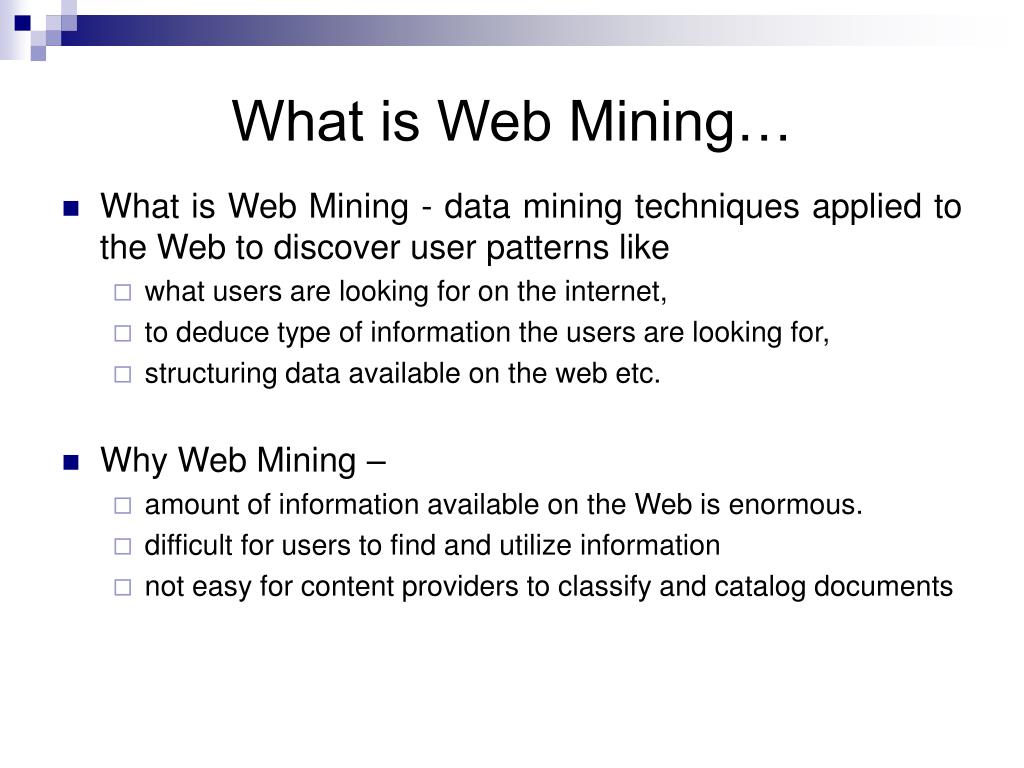 What is Web Mining… • What is Web Mining - data mining techniques applied to the Web to discover user patterns like • what users are looking for on the internet, • to deduce type of information the users are looking for, • structuring data available on the web etc. • Why Web Mining – • amount of information available on the Web is enormous. • difficult for users to find and utilize information • not easy for content providers to classify and catalog documents
