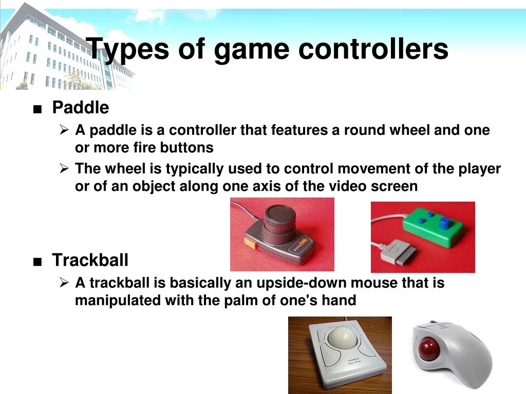 Types of game controllers • Paddle • A paddle is a controller that features a round wheel and one or more fire buttons • The wheel is typically used to control movement of the player or of an object along one axis of the video screen • Trackball • A trackball is basically an upside-down mouse that is manipulated with the palm of one's hand