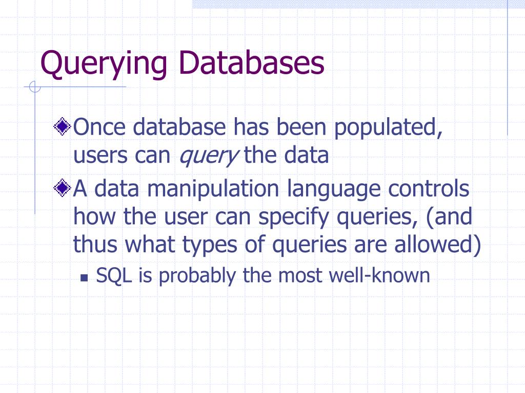 Querying Databases • Once database has been populated, users can query the data • A data manipulation language controls how the user can specify queries, (and thus what types of queries are allowed) • SQL is probably the most well-known