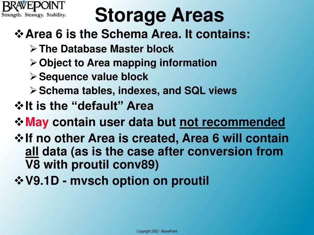 Storage Areas • Area 6 is the Schema Area. It contains: • The Database Master block • Object to Area mapping information • Sequence value block • Schema tables, indexes, and SQL views • It is the “default” Area • May contain user data but not recommended • If no other Area is created, Area 6 will contain all data (as is the case after conversion from V8 with proutil conv89) • V9.1D - mvsch option on proutil