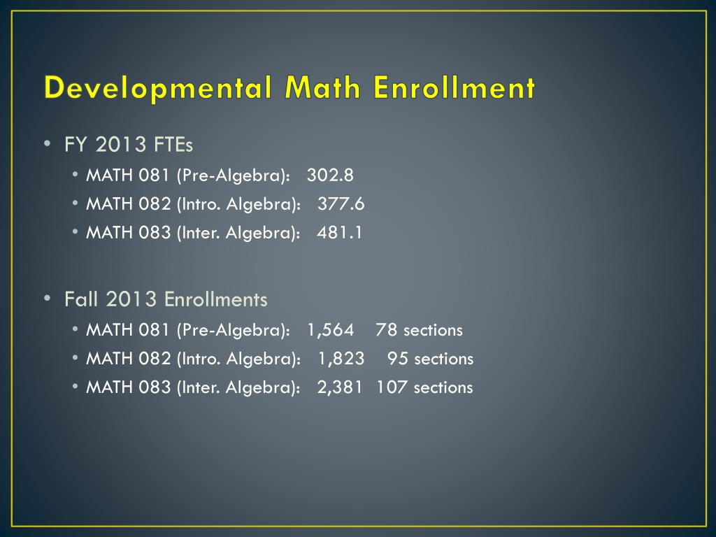 Developmental Math Enrollment • FY 2013 FTEs • MATH 081 (Pre-Algebra): 302.8 • MATH 082 (Intro. Algebra): 377.6 • MATH 083 (Inter. Algebra): 481.1 • Fall 2013 Enrollments • MATH 081 (Pre-Algebra): 1,564 78 sections • MATH 082 (Intro. Algebra): 1,823 95 sections • MATH 083 (Inter. Algebra): 2,381 107 sections