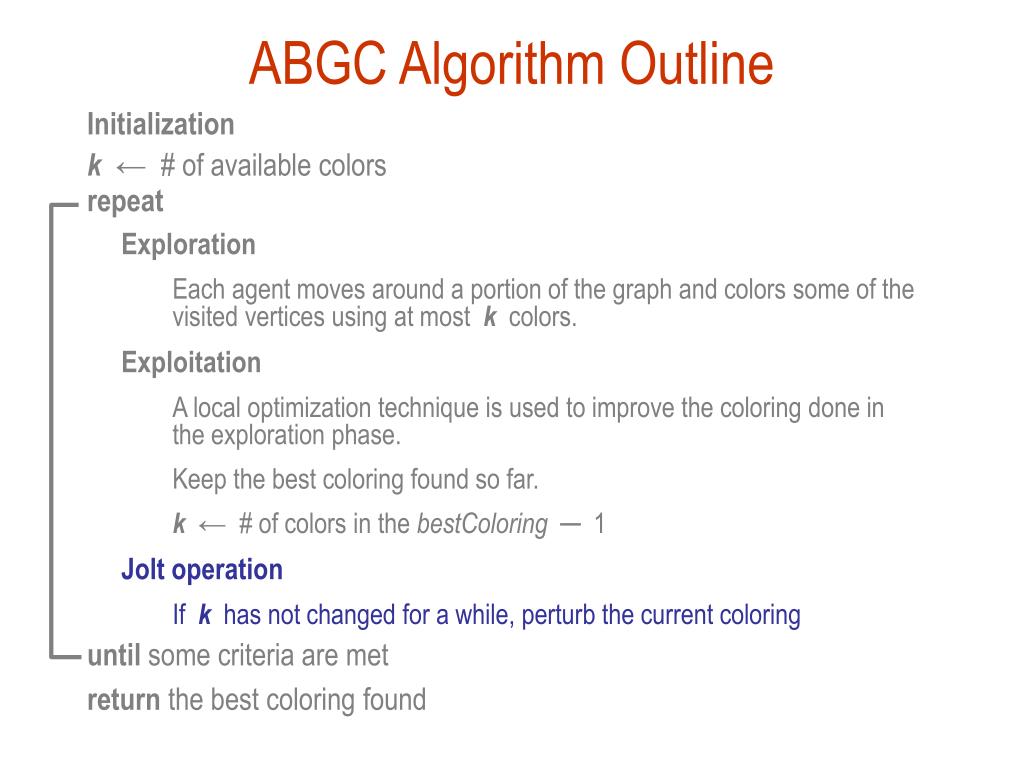 ABGC Algorithm Outline Initialization k←# of available colors repeat until some criteria are met Exploration Each agent moves around a portion of the graph and colors some of the visited vertices using at most k colors. Exploitation A local optimization technique is used to improve the coloring done in the exploration phase. Keep the best coloring found so far. k ← # of colors in the bestColoring─ 1 Jolt operation If k has not changed for a while, perturb the current coloring returnthe best coloring found