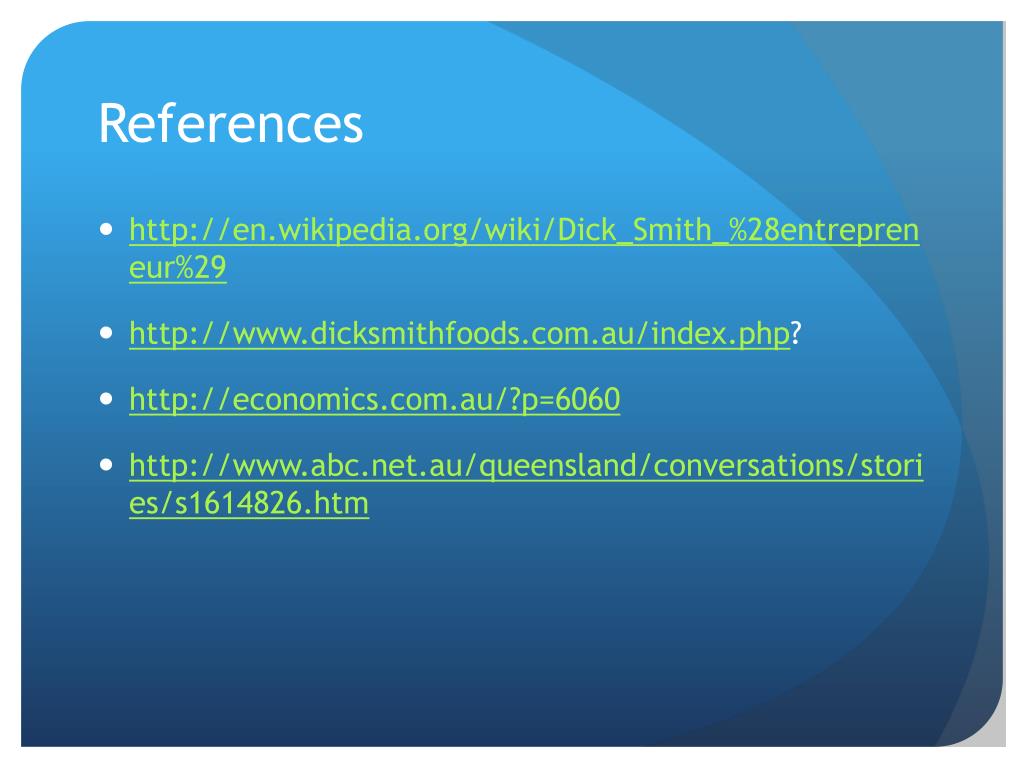 References • http://en.wikipedia.org/wiki/Dick_Smith_%28entrepreneur%29 • http://www.dicksmithfoods.com.au/index.php? • http://economics.com.au/?p=6060 • http://www.abc.net.au/queensland/conversations/stories/s1614826.htm