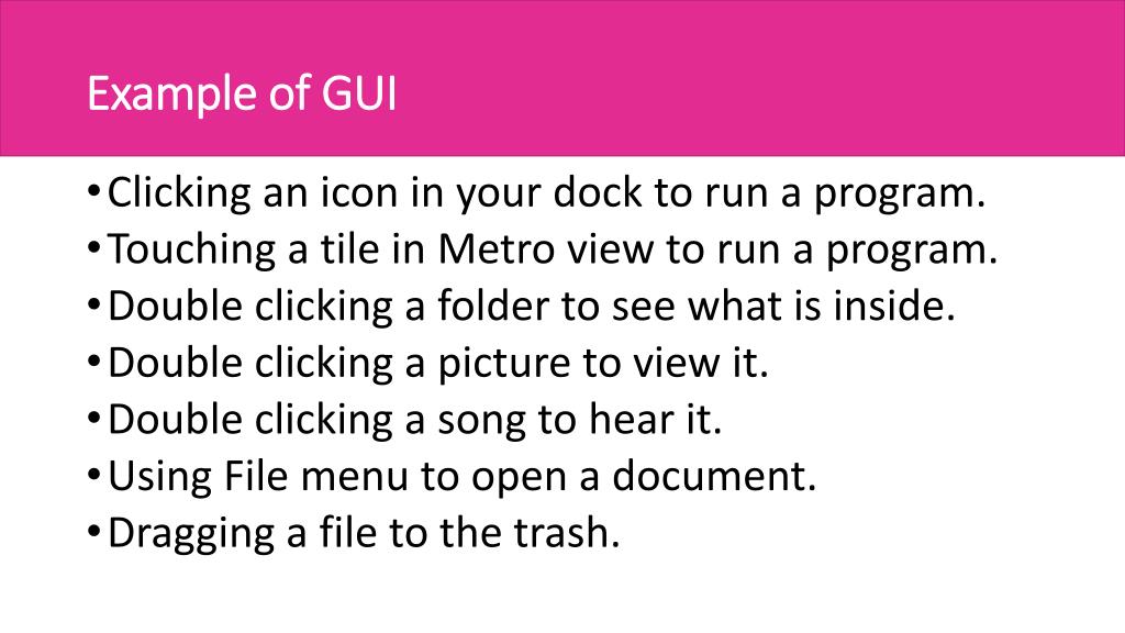 Example of GUI • Clicking an icon in your dock to run a program. • Touching a tile in Metro view to run a program. • Double clicking a folder to see what is inside. • Double clicking a picture to view it. • Double clicking a song to hear it. • Using File menu to open a document. • Dragging a file to the trash.